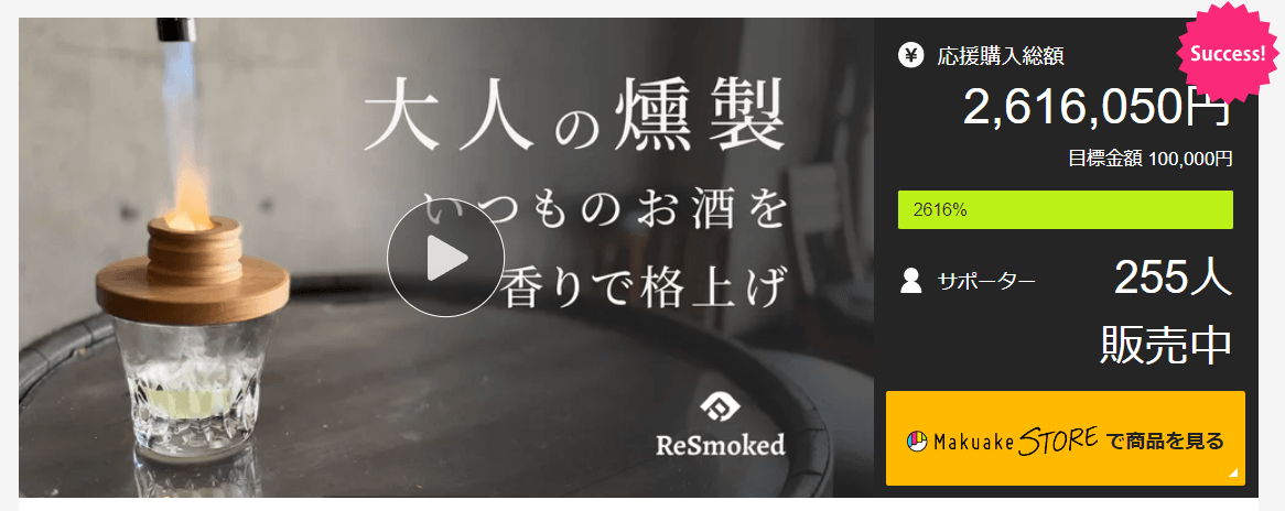 前回プロジェクトのグラスの上でお酒やおつまみを瞬間燻製で美味しくする、燻製キット「ReSmoked」では、応援購入額:261万円、サポーター数:255人と多数の方々より、応援購入いただきました。