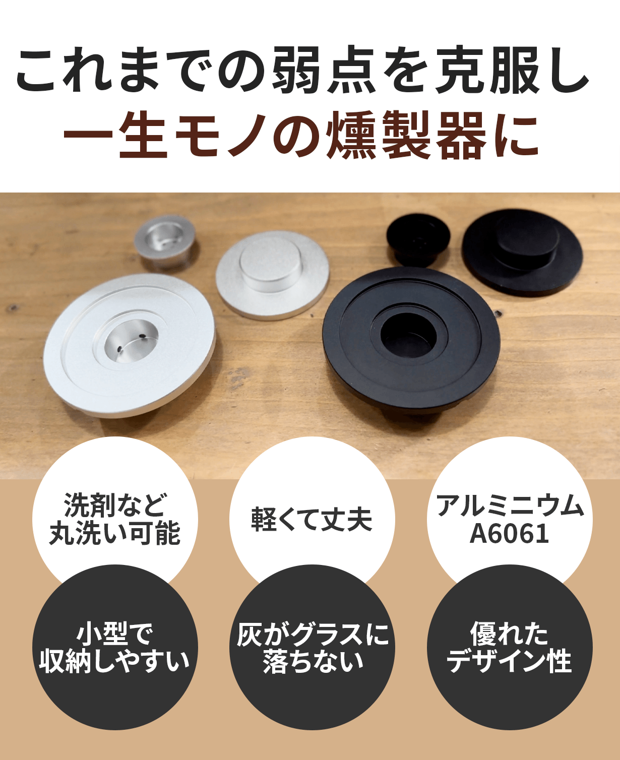 そして、前作の木製から8カ月の試作期間を経て、アルミニウム金属製(A6061)で軽くて丈夫で何度もお使いいただけるよう「ReSmoked」がVer.2.0として、さらに進化を遂げました。