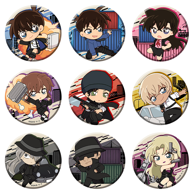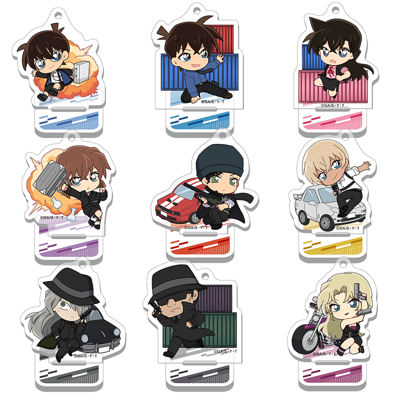 江戸川コナン/工藤新一/毛利蘭/灰原哀/赤井秀一/安室透/ジン/ウォッカ/ベルモットの全9キャラで展開。スパイのような衣装を身にまとい、動きのあるポーズの商品デザインです。