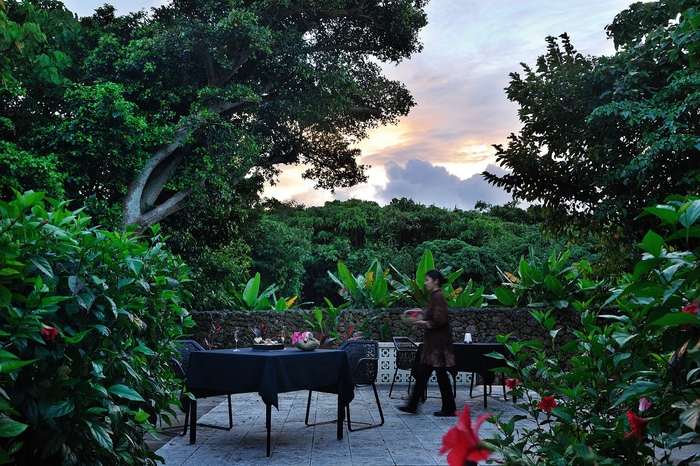 島の風、空、花や緑といった自然を存分に体感できるよう、屋外でアペリティフを提供します。ダイニングからほど近い場所に設けた「風のテラス」で味わうのは、ジーマミー豆腐やちんすこうなどといった沖縄の郷土料理にちなんだフィンガーフードです。薄暮のころ、時間の経過とともに移り変わる美しい空の色を眺めながら、食前の時間を満喫できます。