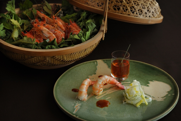 車エビを命草(ぬちぐさ)(*3)で蒸しあげ、素材の旨味を引き出しました。車エビが持つ甘みを生かすためソースは柔らかな風味にまとめています。料理にはさらに、殻出汁を使用したコンソメを添えました。素材の旨味を余すところなくできる味わえる一品です。