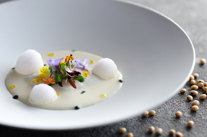 大豆や芋が中心だった竹富島の食文化から着想した温前菜です。これまで植物性の素材は、メイン食材の引き立て役となることが大半でした。しかしこの料理のメインに用いたのは、肉や魚に続く第3の選択肢として注目される植物由来食品「Deats(ディーツ)」(*1)です。これに、かつて沖縄で盛んに栽培されていたキャッサバ芋の粉(タピオカ粉)や豆乳などを混ぜ合わせ、これまでにない味わいと新食感のクネル(*2)を作りました。畑素材の面影をかすかに残しつつも臭みのない味わいで、舌触りは柔らかくも絶妙な弾力が感じられます。このクネルにシェーブルクリームソースでコクと旨味を重ね、冬らしくまろやかに仕上げました。これは島で古くから馴染みある山羊食文化からヒントを得たものです。フランス料理の技術と植物由来食品を用いて、島の食文化を現代に再構築したサステナブルな新料理です。