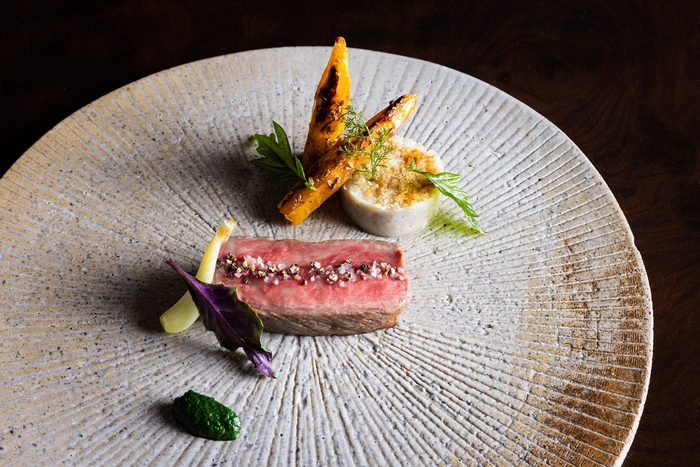 炭火焼きにした超熟成牛(*4)に、フーチバ(ヨモギ)や長命草などの香り高い命草のピュレをアクセントにしました。熟成することで旨味と甘みが凝縮した肉を、中に水分を閉じ込めたまましっとりとした焼き加減で仕上げています。命草の爽やかな風味で味の変化も楽しめます。