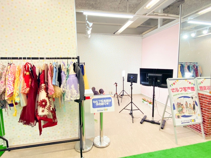 キッズランドUSで遊んだ思い出を記念にパシャリ!セルフ写真館では、本格的な撮影セットと豊富な衣装や小物を追加料金なしでご利用いただけます。気軽に記念撮影をお楽しみください。