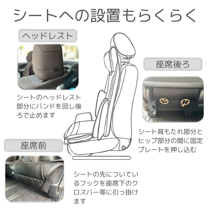 厚みはわずか約5cm、重量は5.9kg、折り畳んでも約10cmと他にはない薄さ軽さで女性でも軽々と持ち運べるコンパクト設計。更にはバンドで止めるタイプで装着も実に簡単。シートタイプだから、車に限らず自宅のイスやソファー、とりわけゲーミングチェアとの相性は抜群。