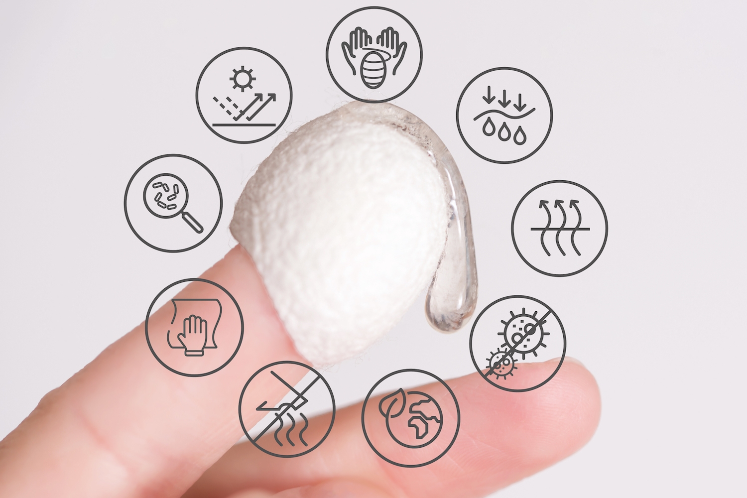 シルクは医療用縫合糸として、2500年前から使用される程に人体との親和性が高いとされる。またシルクのたんぱく質(フィブロイン)は、人がもともと持っている皮膚の保湿成分とのバランスが似ており、肌への親和性が高いとされている。その他にも、吸湿性/透湿性・UV効果・細胞の遊走性などの機能があるとされる。*記載はシルクの性質についてのことです。