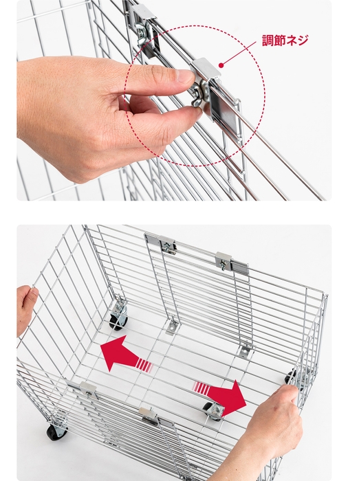 1サイズでありながら、20cmの幅調節が可能なのでコンパクトかつ、ご使用状況や環境に合わせて対応できるキャスター付きのワイヤーバスケットです。