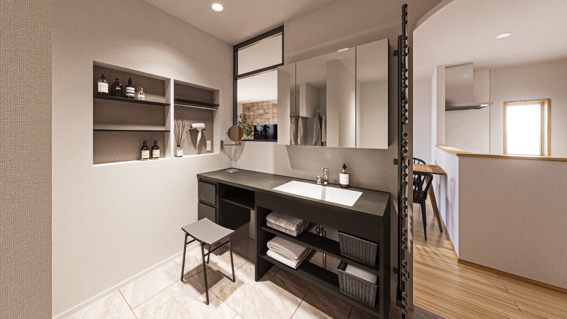 パウダールームは、広々としたカウンター付きで、座ってじっくりとスキンケアやメイクができる贅沢な空間です。ニッチ収納、タオルウォーマー、ドライヤーホルダーなども完備し、快適性と時短を両立させました。日々のストレスを忘れ、自分自身と向き合うための大切な場所となります。