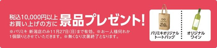 オープンを記念し、税込10,000円以上お買い上げの方に、パリミキオリジナル「トートバッグ」「ワイン」の何れか1つをプレゼント!