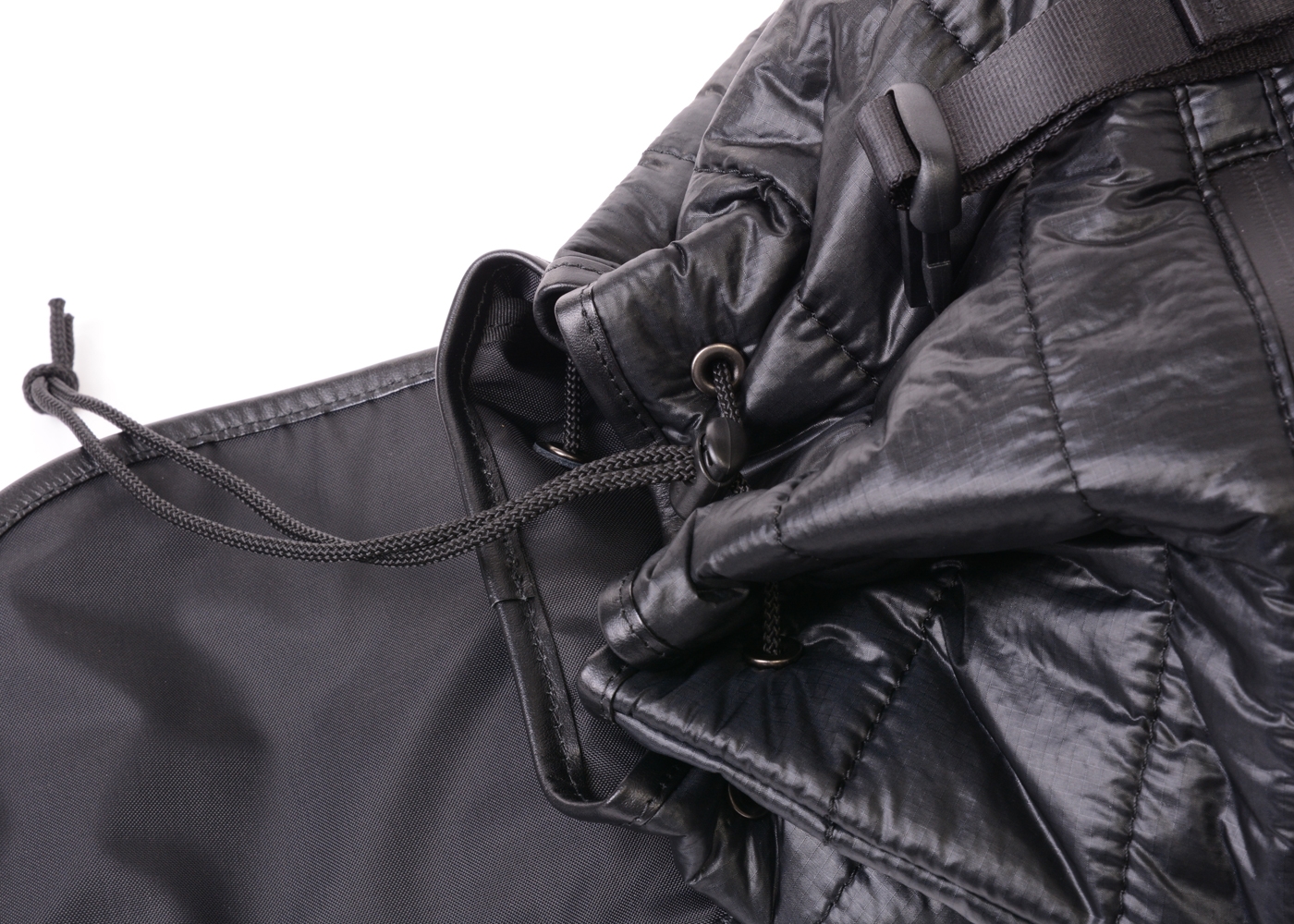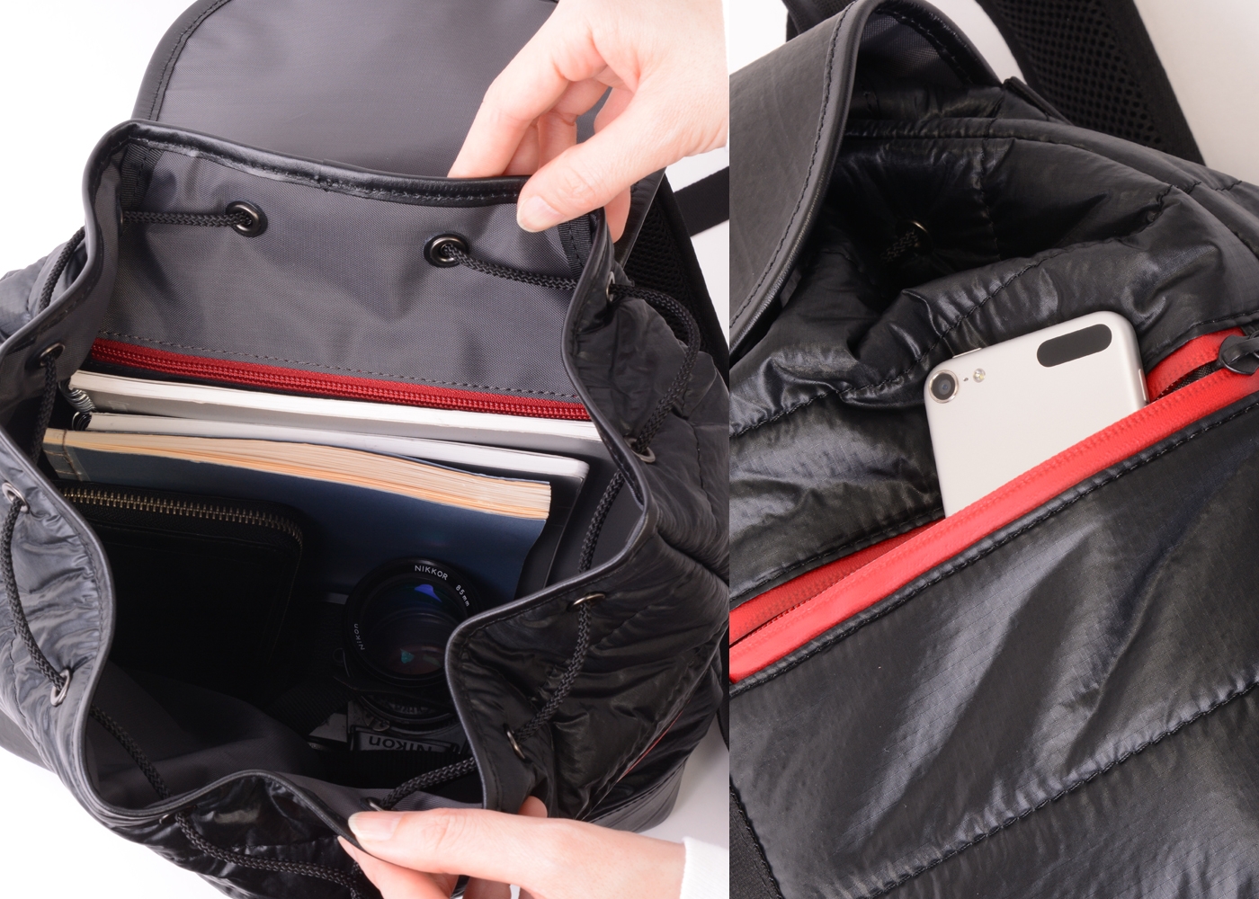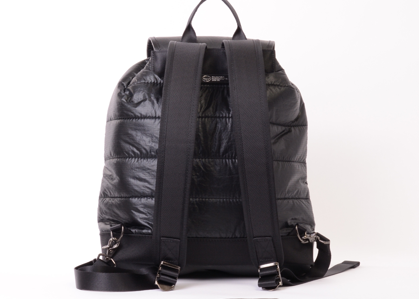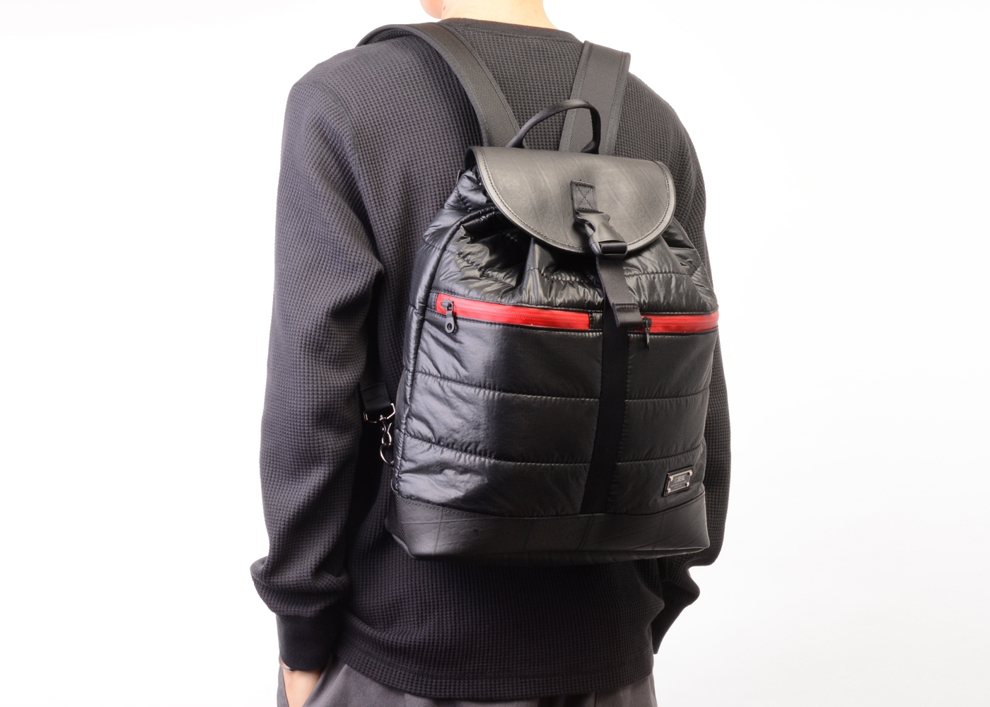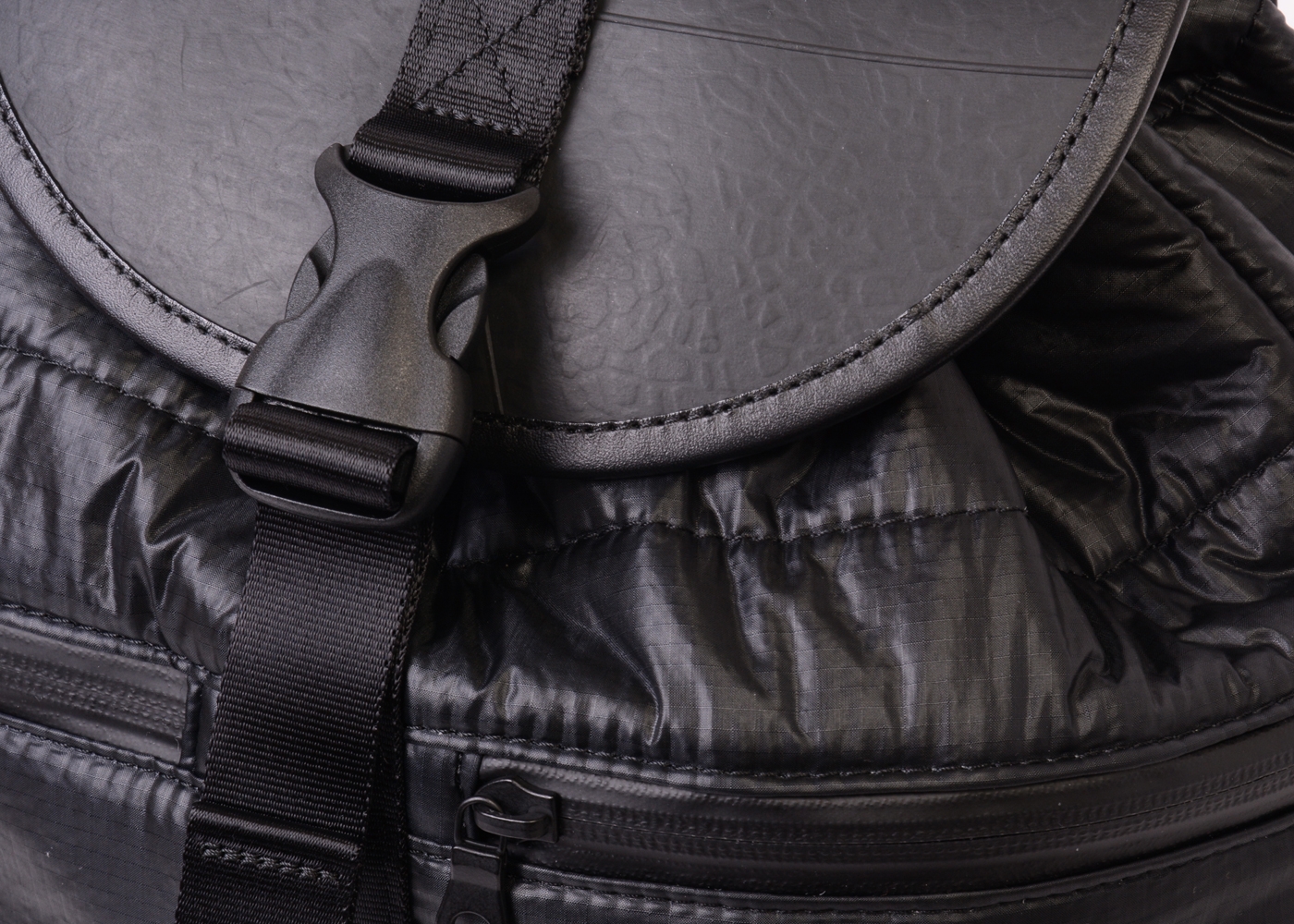 本製品は、国内唯一の人体用落下傘の製造会社「藤倉航装」より提供された航空自衛隊でも採用されているパラシュートクロスと同等の生地を全面に起用。非常に薄くて軽いパラシュートクロスをキルティング加工をする事により、軽さを保ちながら強度と防水性を生み出しています。さらに、中の荷物を雨などから守るため底面やフラップ部分には使用済みタイヤチューブを使用しているので、雨の日のご利用はもちろん濡れている地面などでも気にせず置くことが出来ます。メイン収納はA4サイズ対応となっており、間口は巾着タイプで大きく開くため中身が取り出しやすくなっています。また外側の止水ファスナーポケットは2つあり、小さめサイズの財布やスマホ、またペットボトル入れとしてもサッと取り出す小物入れとして使用することができます。リュックショルダーにはクッション素材を採用し、重い荷物を持った際も肩への負担を軽減し、快適な背負い心地を実現しました。