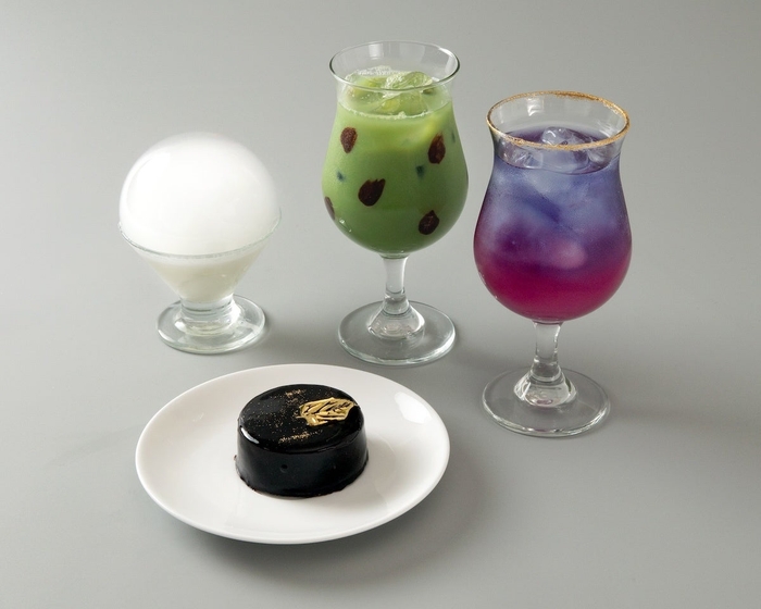 鈞窯(きんよう)特有の鮮やかな天青色釉と紫紅釉を、バタフライピーティーとレモンシロップ、パイナップル&ライチジュースで表現した、目にも鮮やかなオリジナルドリンクです。縁の金箔のアクセントが高貴さと非日常を演出します。