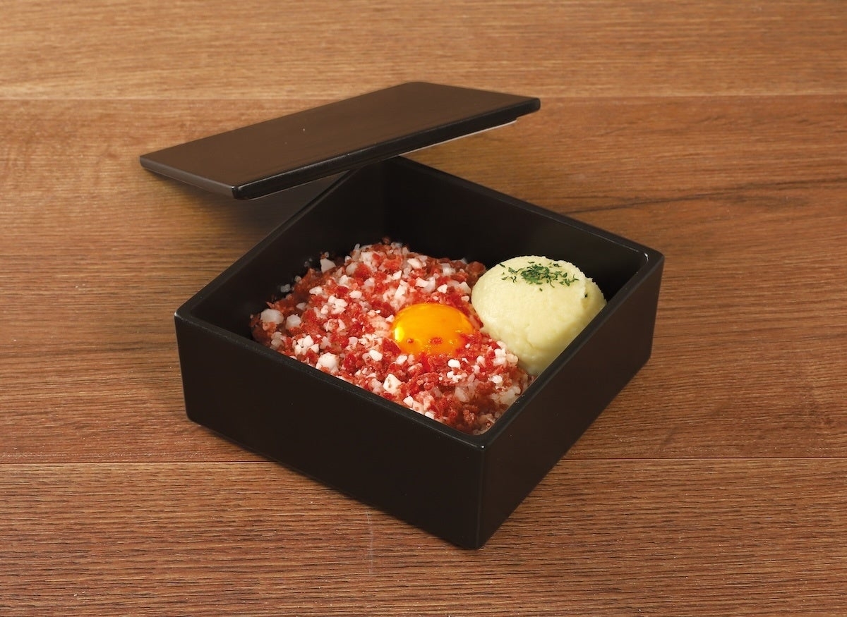 北海道産牛を生ハム状に加工した冷凍フレークを熱々のご飯に乗せると…、フレークがとろけて何とも言えないまろやかさに。醤油と卵に絡ませて、口溶けをお楽しみください。マッシュポテトとの相性も抜群です。お重の高級感が特別なひとときを演出します。