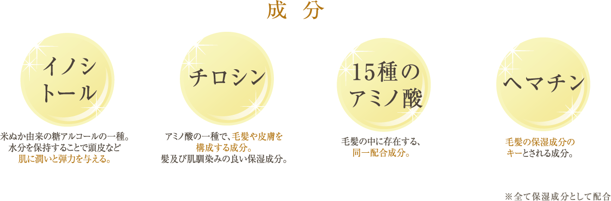 「空洞化」補修プロセスにより、毛髪・頭皮の汚れを洗浄後、ヘマチン(保湿成分)が毛髪の表面に吸着し、ドライヤーの熱ダメージやカラー、パーマで傷んだ髪の毛先まで補修して滑らかに。