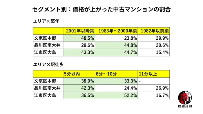 「エリア×築年」を見ると文京区本郷では2001年以降築が約49%、品川区南大井では1983年~2000年築が約45%、江東区大島では1983年以降築が約44%の割合で価格が上がりました。