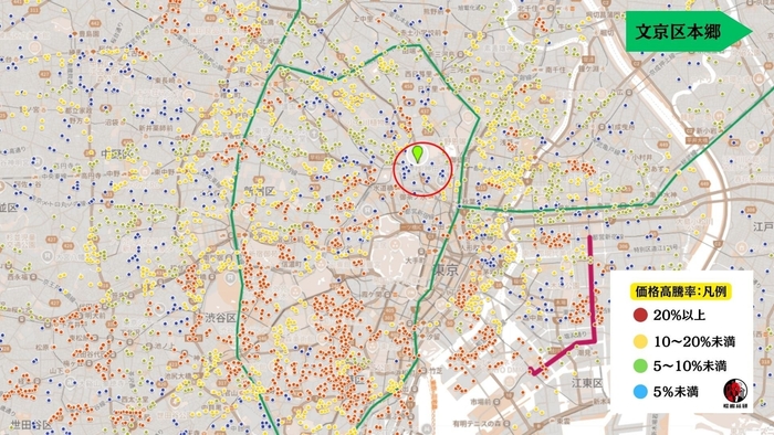例えば、文京区本郷の2001年築以降のマンションは、100棟中49棟すなわち約半数が価格が上がったと言えます。