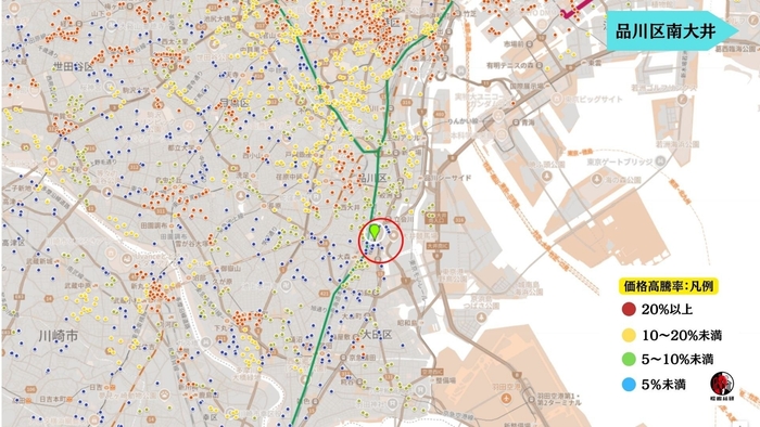 周辺には大井町駅や品川駅といった主要駅があるものの、相対的に交通利便性や再開発の進行状況、商業施設や生活インフラがやや不足しているため、大井町駅や品川駅周辺に人気が集中しやすい傾向があります。その結果として、当該エリアの価格は上がりにくいと考えられます。また工業エリアや倉庫街、物流施設が多く残っている地域でもあり、住居エリアとしては需要が限定されがちです。