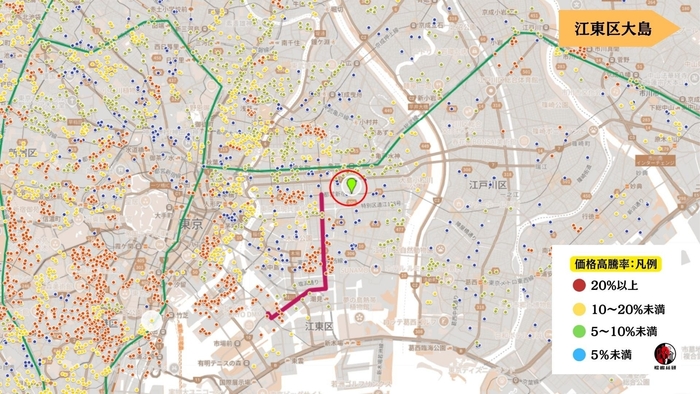 大島エリアは海抜が低く、洪水時に水位が上昇すると、浸水被害を受ける可能性があります。更に東京湾に比較的近く、近隣には隅田川や荒川が流れており、河川の増水による影響を受ける可能性が高いため、価格が上がりづらいと考えられます。