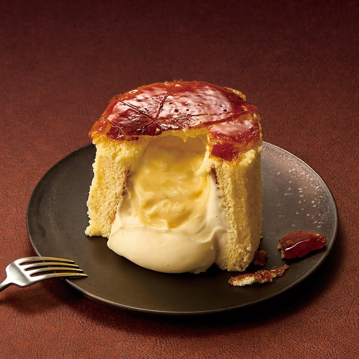 琥珀色に輝くブリュレを割ると、なめらかで濃厚なカスタードクリームと生クリームを混ぜ込んだ生カスタードクリームの2種類がとろりととろけ出します。周りのふわふわしっとりスポンジ生地と一体となり、絶妙な美味しさを奏でます。1~2名様でもお召し上がりいただけるようなボリュームいっぱいの一品です。