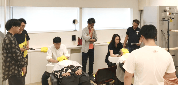その後、学生全員がヘッドスパを体験し、理容組合員との話し合いを繰り返して、リラックス効果を高めるために「(1)スパとシャンプーの一連の流れを完全に分ける。(2)椅子を寝かせて一番楽な姿勢で行う。(3)視覚、聴覚を遮断する」の3つの提案を行いました。