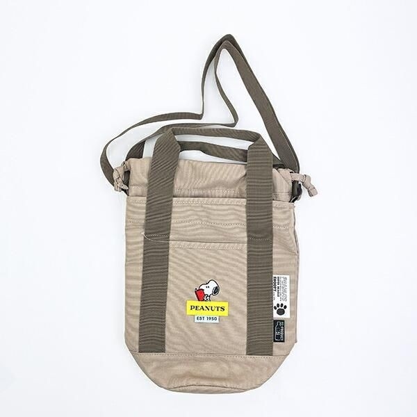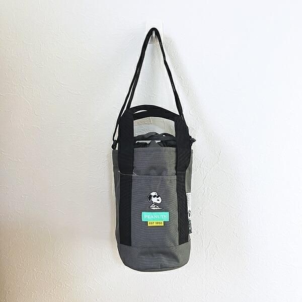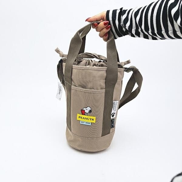 スヌーピーのドラムショルダーバッグ。上が絞れて巾着仕様がユニークでおしゃれな見た目です。