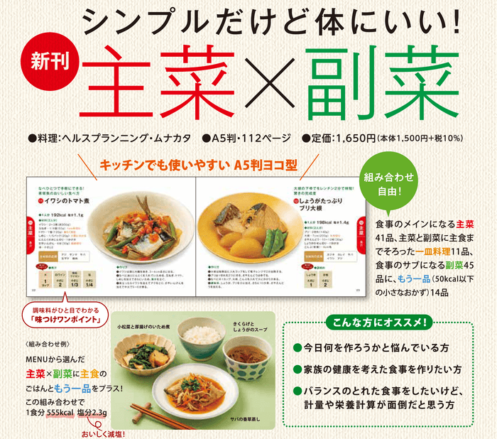 主食・主菜・副菜がそろった理想的な食事を、もっと手軽に。毎日の献立に悩んでいる方、家族の健康を考えたい方、料理初心者の方にもぴったりの一冊です。