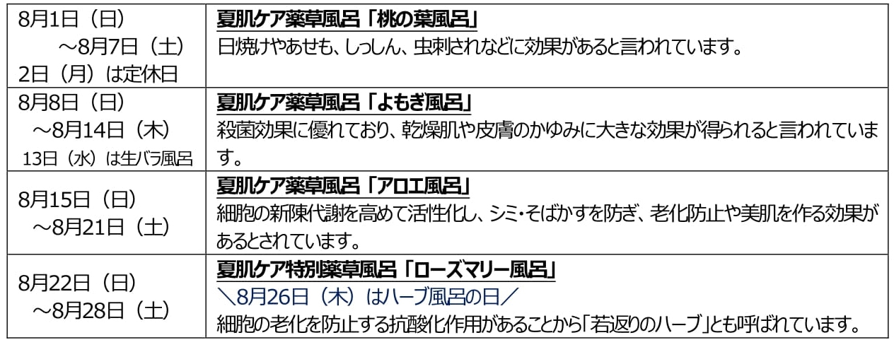 今月は夏肌ケアにぴったりの薬草風呂をご用意いたしました。また、物販コーナーにはお得なスキンケア用品を用意しております。