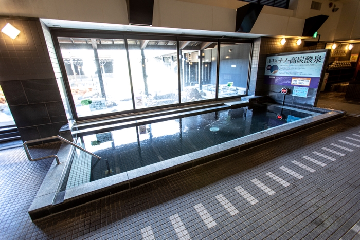 内湯には、保湿、浸透力に優れたナノウォーターに高濃度炭酸ガスを溶かし込んだ療養泉と同じ濃度の「ナノ高炭酸泉」、露天風呂では、天然温泉に美肌効果が期待できる高濃度な炭酸泉を混ぜ合わせた「癒しの湯」が楽しめます。また、女湯では3分100円で炭酸シャワーが楽しめます。