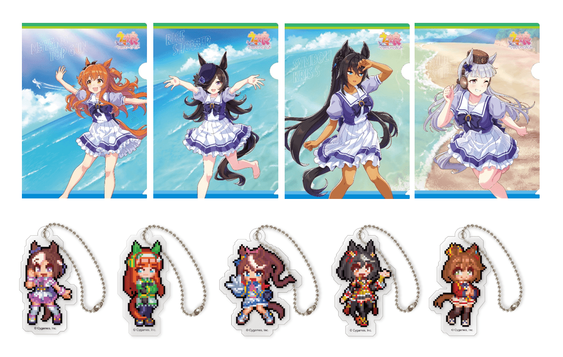 オリジナルA4サイズクリアファイル(上)、「ウマ娘 プリティーダービー 熱血ハチャメチャ大感謝祭!」ドット絵アクリルチャーム(下)