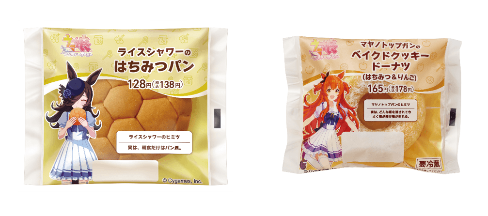 【内容】朝食はパン派であるライスシャワーと、ゲーム内にも登場するはちみつパンを掛け合わせた商品です。ふんわりもっちりとした食感のパンに甘酸っぱいはちみつゼリーと塩味の効いたマーガリンをサンドしました。専用の型を使用し、ハチの巣をイメージした見た目にしています。