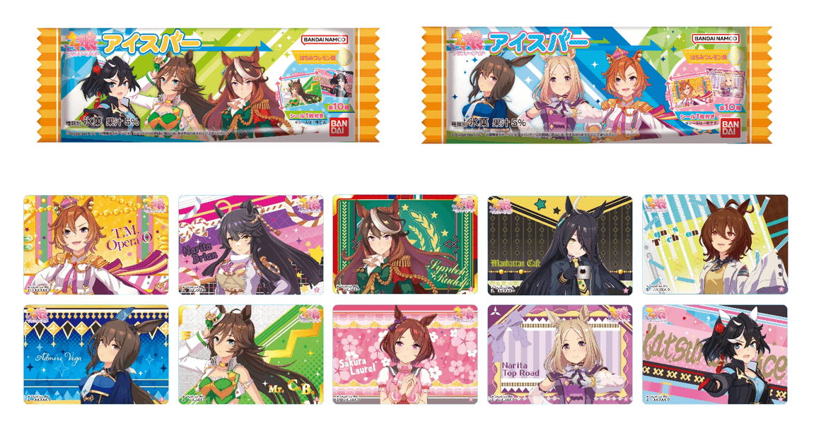 【内容】ウマ娘に登場する「はちみードリンク」をイメージしたアイスバーです。パッケージは2種類展開、全10種類のオリジナルシール(ランダム)付きです。
