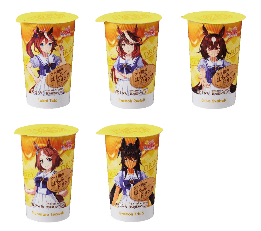 【内容】ウマ娘に登場する「はちみードリンク」をイメージしたチルド飲料です。パッケージデザインは全5種類展開しています。