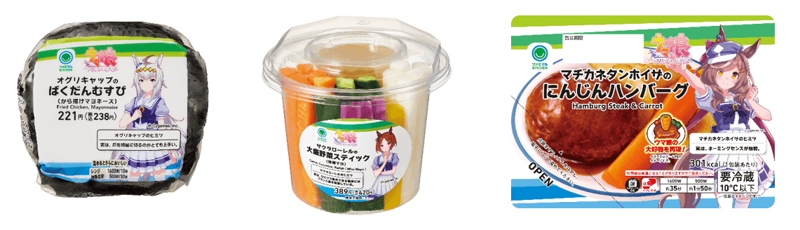 オグリキャップのばくだんむすび(から揚げマヨネーズ)(左)、サクラローレルの大盛野菜スティック(味噌マヨ)(中)、マチカネタンホイザのにんじんハンバーグ(右)