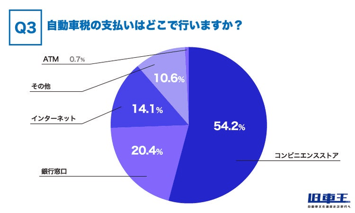 旧車乗りに自動車税の支払いをどこで行うか聞いてみたところ、最も多かった回答が「コンビニエンスストア」で54.2%でした。