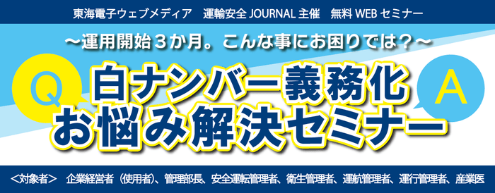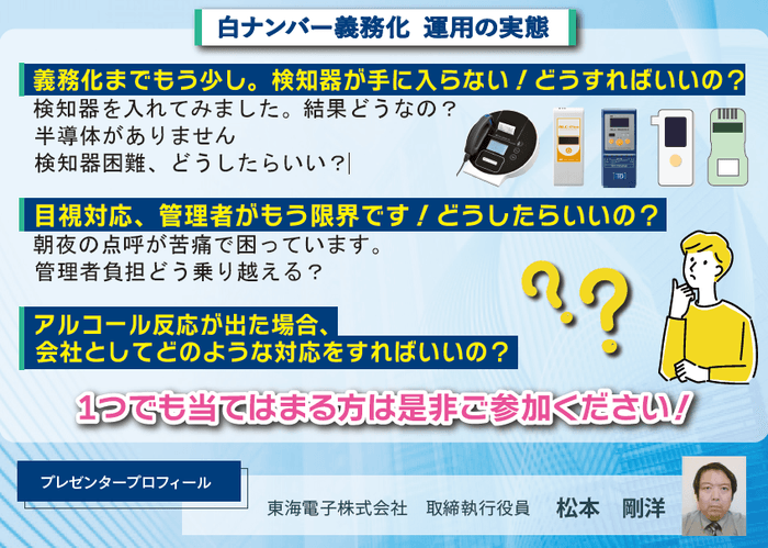 飲酒運転防止のためのアルコール検知器及びIT点呼システムを開発・販売する東海電子株式会社(本社:静岡県富士市 代表取締役:杉本 哲也)は、 この度、 『 白ナンバー義務化 お悩み解決セミナー』(無料)を8月9日(火)と8月25日(木)に開催いたします。