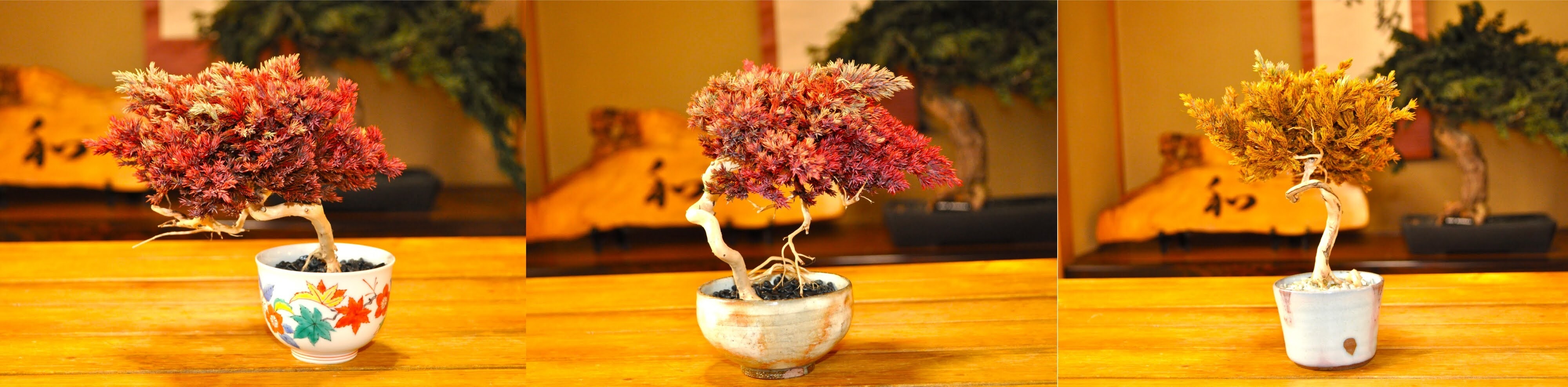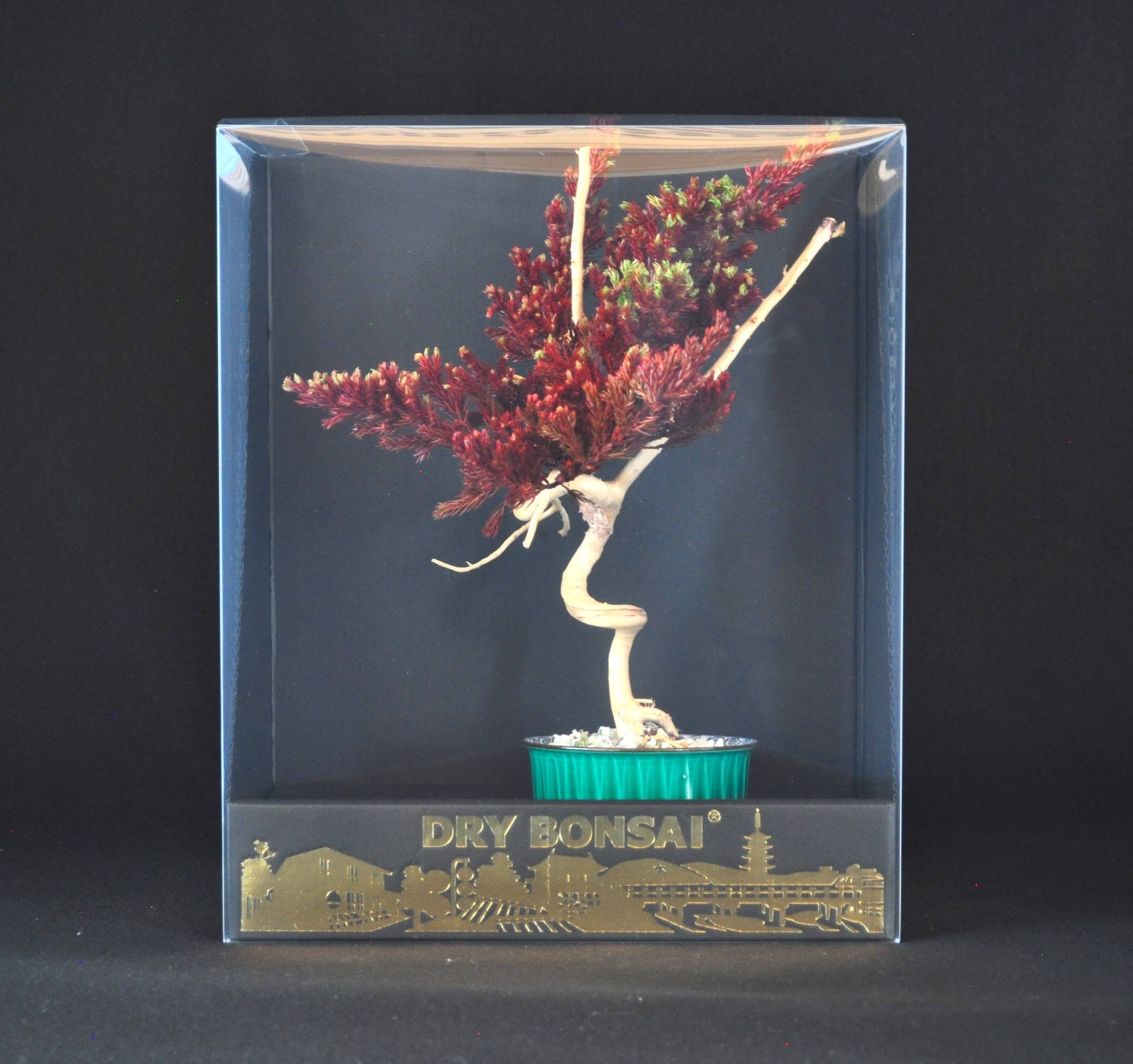 盆栽アート作家、藤田 茂男氏の監修の元、本物の盆栽の木、葉を使用して創る、新たな試みです。もっと気軽に盆栽を楽しんでいただきたいという気持ちを込め、世界で初めてプレゼントボックスに入れた盆栽商品を作成いたしました。急増しているインバウンド旅行客のお土産にもぴったりの商品です。盆栽枝葉の種類は、松柏類の皮を剥ぎ磨き上げた盆栽樹を基本に、コニファー類をプリザーブド加工で色を付け、ドライ化した葉を使用しております。葉の色はレッド、イエロー、グリーンの3パターン。世界に一つだけのオリジナルドライ盆栽をお楽しみください。