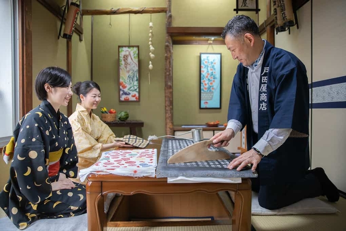 天正18年(1590年)日本橋創業の老舗団扇店「伊場仙」では、持ち手や骨もすべて一本の竹を割いて作られた江戸団扇やシンプルな柄が特徴の江戸扇子を購入できます。同じく日本橋に店を構える1872年創業の老舗「梨園染 戸田屋商店」では、熟練の職人が繊維の芯まで染料を浸透させる伝統工芸の注染で染めた手ぬぐいに触れられます。また、手ぬぐいの作り方について教わることができるのも、本サービスならではの体験です。金魚や風鈴、朝顔といった夏らしい柄の手ぬぐいは、汗を拭うだけでなく、季節の設えとしてお部屋に飾るのもおすすめです。