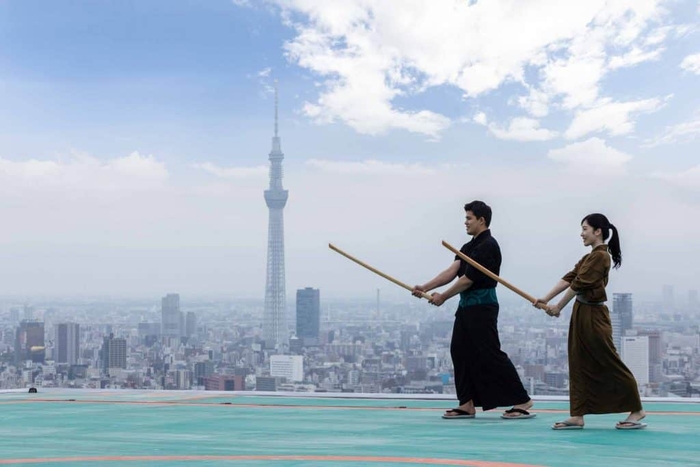 朝の清らかな空気の中、地上160メートルのビルの屋上で剣術稽古を行い、心身をリフレッシュします。大きく開けたビル屋上からは、東京の朝の絶景を楽しめます。