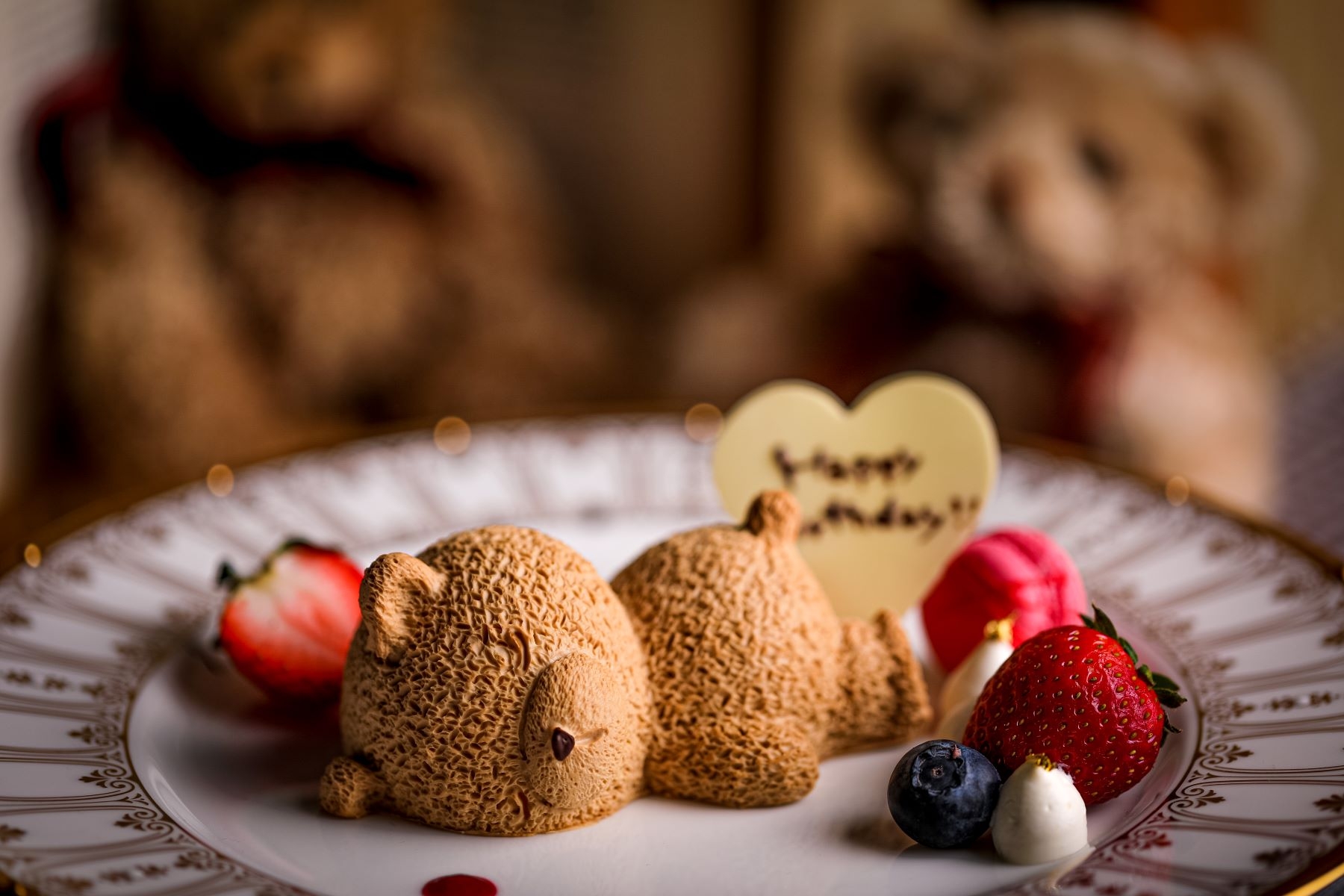 オプションの「スリーピングベアケーキ」は、“横になって寝ている、ゆるかわいいクマ”を表現。表面のショコラムースの中は“クレームバニーユ”と“クーリーフランボワーズ”で構成されており、2種類の味が楽しめるパティシエこだわりの一皿に。