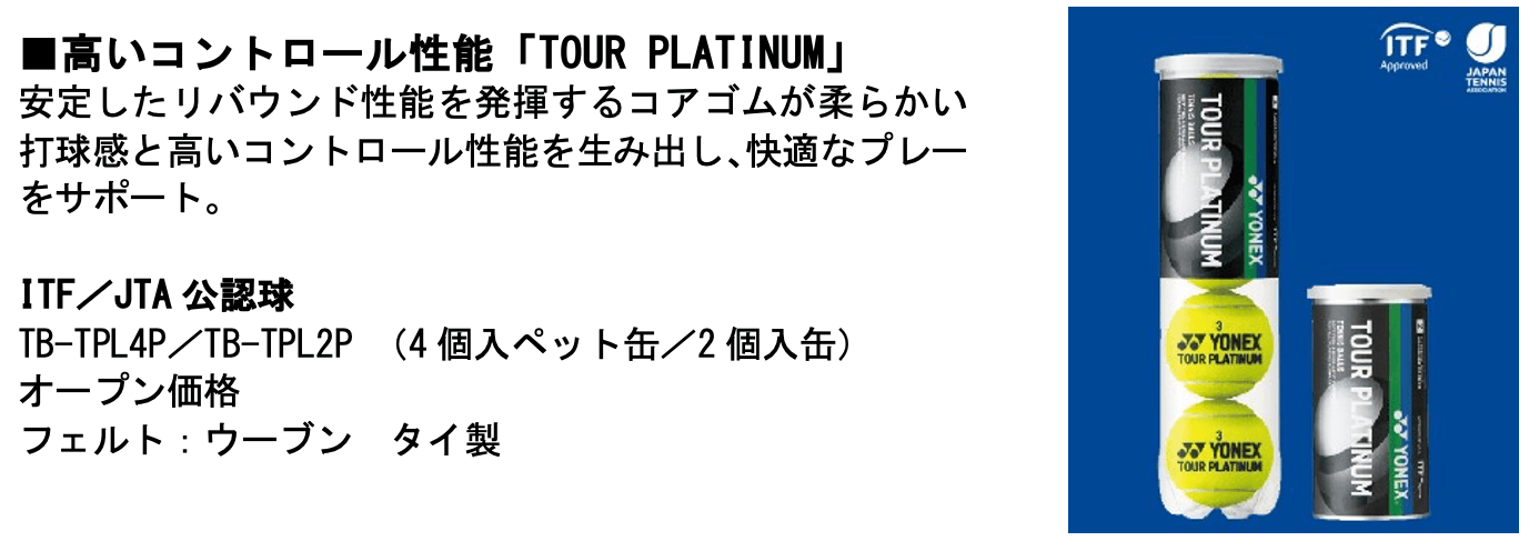 ヨネックスは自社テニスボール工場をタイに持ち、そこで生み出される製品は、安定した飛び性能と高い耐久性を誇り、世界のトップ選手からも厚い信頼を得ています。昨年度は東レ パン パシフィック オープンテニストーナメントをはじめ数々の大会でオフィシャルボールとして採用されました。今回、ITF/JTA公認球である「ツアープラチナム」がアジアを代表するATPツアーの3大会においてオフィシャルボールとして採用されたことは、その品質と性能が国際的に高く評価された証です。