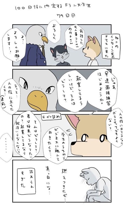 まもなく“100⽇”をむかえる当作品の中で、主⼈公の⽝くんは就活を通して様々な経験をしてきました。