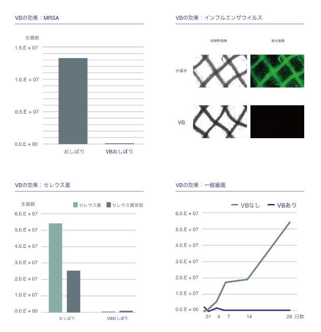 常に感染リスクと隣り合わせにある日常生活では、VB加工の強みが活かされます。VB加工は、以下の各データからも抗菌・抗ウイルス対応力が、実証されています。