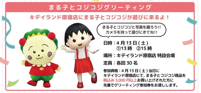 参加資格:当日キデイランド原宿店にて、まる子とコジコジ商品を税込3,000円以上お買い上げされた方に先着でグリーティング参加券をお渡しします。