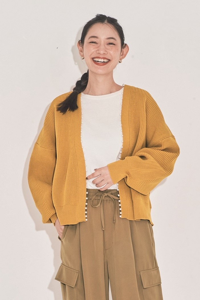 また、トレンドのコンパクト丈のフェイクパールを使った畦編みニットカーディガンは、ボリューム感のある袖と襟ぐりのフェイクパールがポイント。