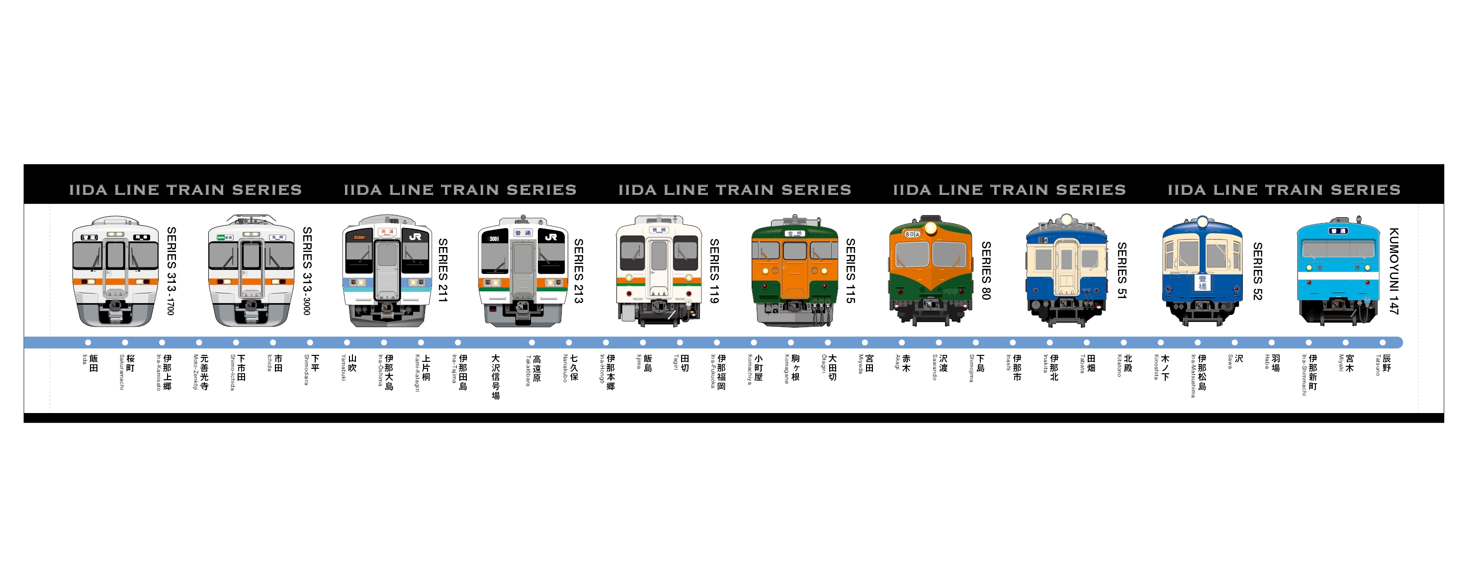 373系(飯田線秘境駅号)、313系1700番台、313系3000番台、213系、211系、119系、115系、165系、80系、51系、52系、クモユニ147、ED18 2(トロッコファミリー号)、EF58 157(トロッコファミリー号)