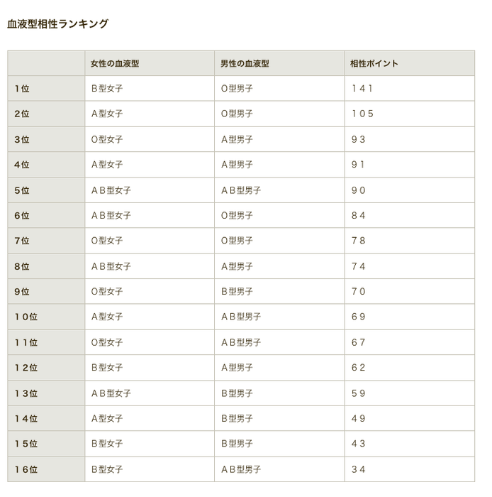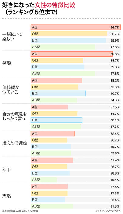 A型女子はO型男子、O型女子はA型男子、B型女子はO型男子、AB型女子はAB型男子がもっとも相性が良い相手という結果でした。