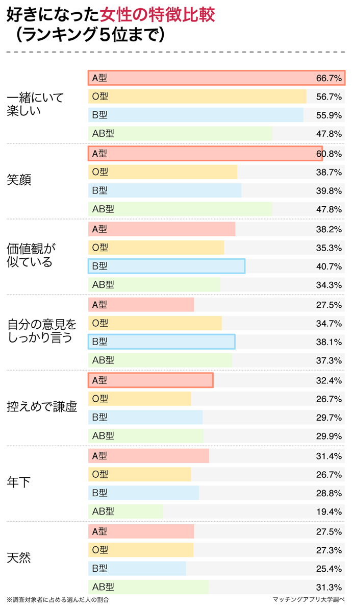 A型男子は、控えめで謙虚な年下女性を好み、自分の意見をしっかり言う女性は好まない人が多いようです。一方でB型男子は、自分の意見をしっかり言い、価値観が似ている女性を好む人が多く、まさに正反対の傾向が見られました。