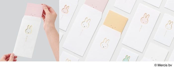 当社が展開する窓シリーズは、かつてマルアイでも製造していた“事務用の窓付き封筒”から着想を得て、窓から覗く色が変わる仕掛けを付加した封筒のシリーズです。封筒の中の添紙(そえがみ)を自由に差し替えることで、封筒本体にあいた窓から見える色が変化します。2020年2月に第1弾となる「窓ぽち袋」を発売し、その後、のし袋やお年玉袋、さらにはカードなどを展開、これまでにシリーズ累計143万枚を販売しました。そんな人気のシリーズに、この度、“ミッフィー”のデザインが新登場します。