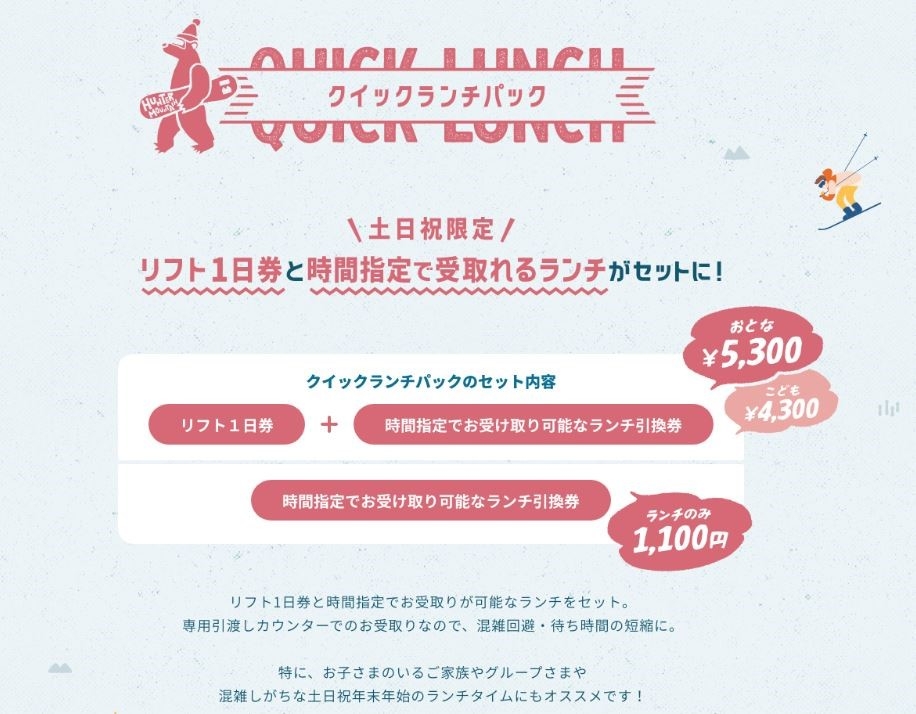 各種商品はWebket https://www.hunter.co.jp/winter/lp/food/ (クレジット、コンビニ決済、楽天決済の利用可)より、ご購入頂きます。購入後に送付されるメールのQRコードを現地のWebket無人発券機にかざし、リフト券を引換えて頂きます。その際ランチの引換券が付帯しているので、クイックランチ引換のお時間になりましたら、センターハウス2F ワールドデリにて引換券をご提出頂き、ランチをお受取り下さい。