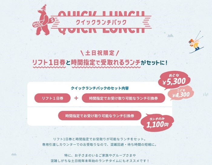 昨年からWEB販売を開始したリフト1日券と時間指定で受け取れるランチがセットされた商品です。今年から6メニューでランチのみも注文可能となり、事前に別途リフト券をご購入の方でも利用が可能となりました。通常リフト1日券の価格に大人/子供共に400円加算された価格となっており、混雑の回避や待ち時間を短縮したい方に向けて企画致しました。持ち運べる容器でのご提供のため、屋外席やお車に戻ってお召し上がり頂く事が可能です。当日各ランチ引換時間までお求め頂けます。
