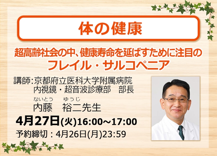 4月のオンライン講座は、現在発売中の健康雑誌『若々』に記事掲載されている専門家に登場いただきます。